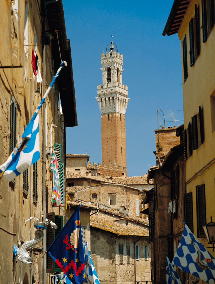 Attraverso le vie e le torri potrete assaporare lo spirito di competizione che dal medioevo è conservato tra le contrade senesi con orgoglio; con lo sventolare delle bandiere e le piazze allestite per il Palio è facile immergersi in un tempo antico, tra i colori dei fantini e lo scalpitare dei cavalli di razza.
